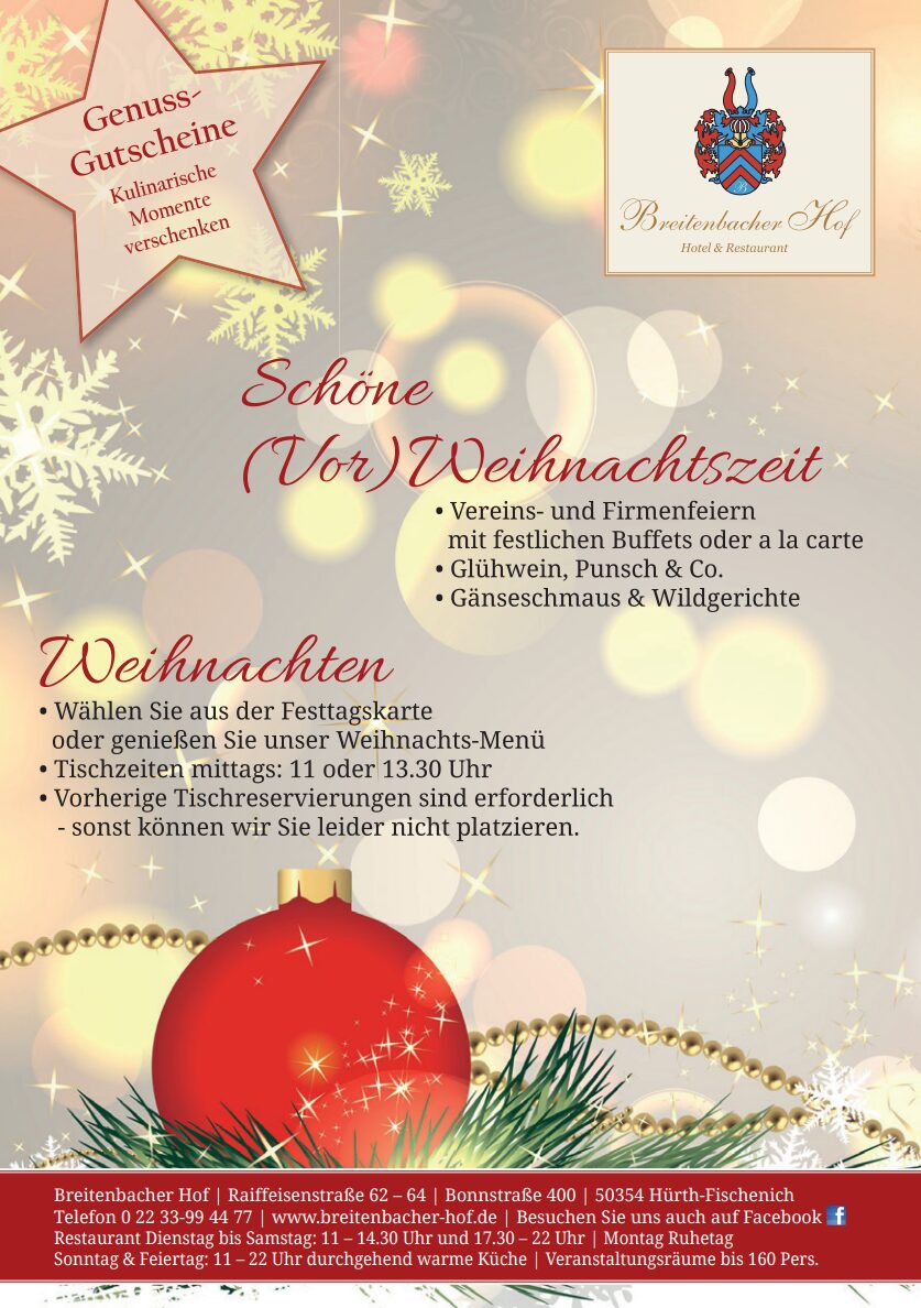Verschenken Sie außerdem Freude: Mit unseren Genuss-Gutscheinen machen Sie Ihren Liebsten ein festliches Geschenk voller kulinarischer Momente.