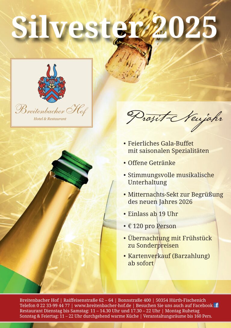 Freuen Sie sich auf ein festliches Buffet, stimmungsvolle Musik und beste Gesellschaft. Gemeinsam stoßen wir um Mitternacht auf das neue Jahr an – mit funkelnden Momenten und guter Laune.